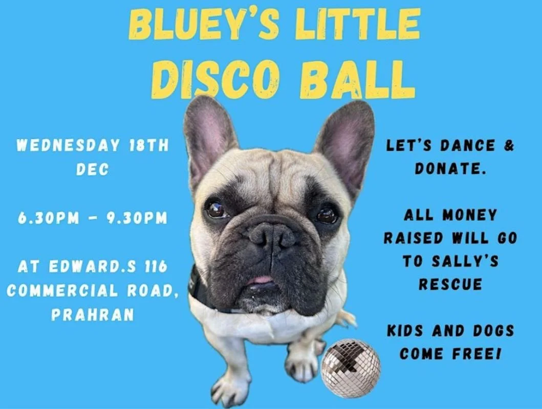About this event Bluey was just 12 months old when she was rescued from what is believed to be a life spent with a backyard breeder, likely living in the shed. As is often the case with these illegal, dangerous and abusive environments for animals, Bluey had been put through a litter of puppies which she was too young for. She was then discarded and ended up being rescued by a volunteer at SALLY'S RESCUE in Melbourne. A team of animal lovers, Sally's Rescue, a foster carer (who fell in love with Bluey) and vets had been gearing Bluey up for her future HAPPY LIFE. After surgery, to help her breathing and after being desexed, she died suddenly and tragically. Bluey never got to have her 'happy ever after'. Bluey's Little Disco Ball is a charity event to raise money for Sally's Rescue and awareness to all about the dangers of these backyard breeders who are making thousands of dollars by using and abusing precious animals like Bluey.